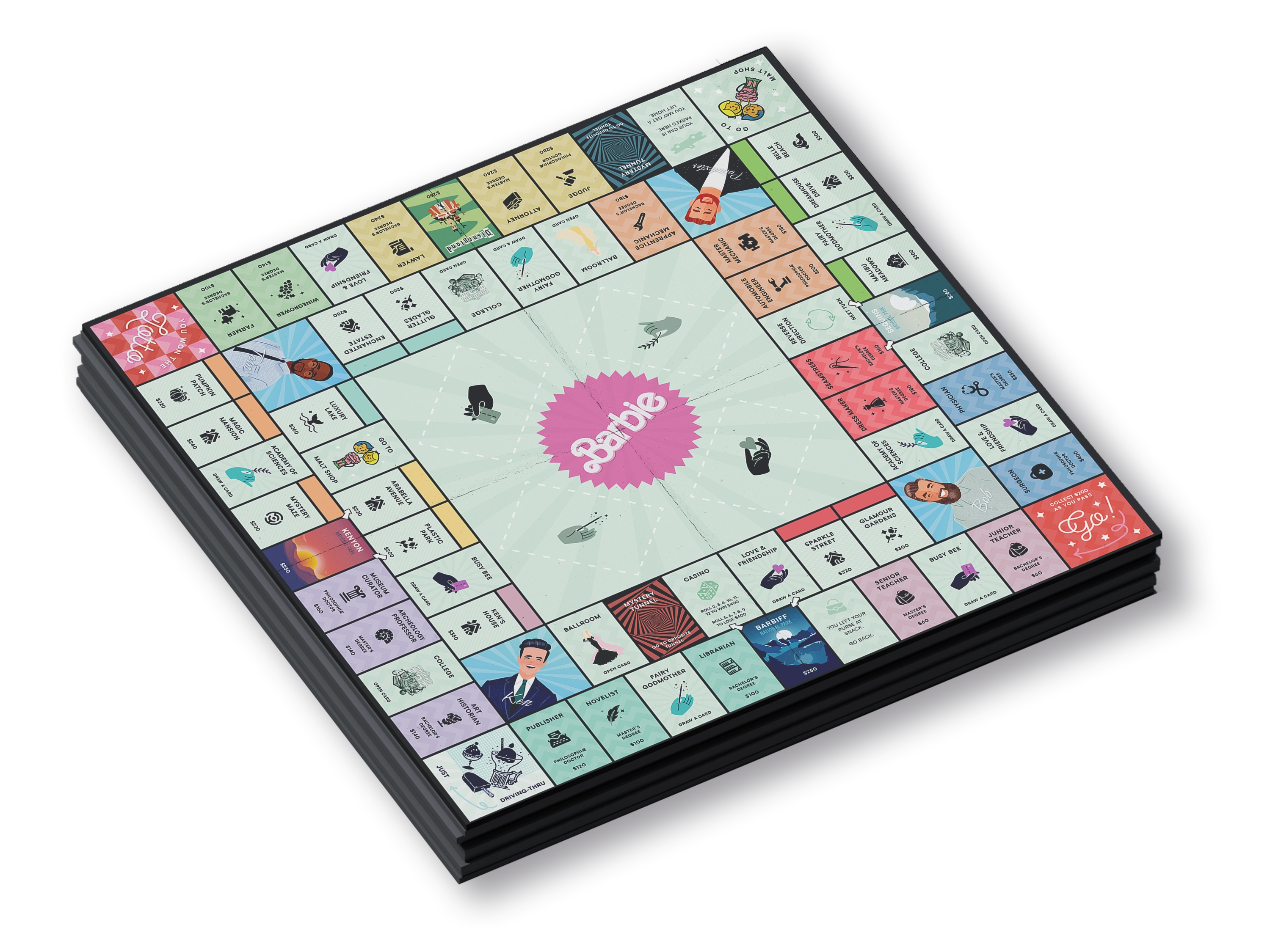 Le plateau de jeu est intégralement basé sur l'univers Barbie. Le jeu possède 3 types de collectables : l'argent, les points d'intellect et les points de relations.