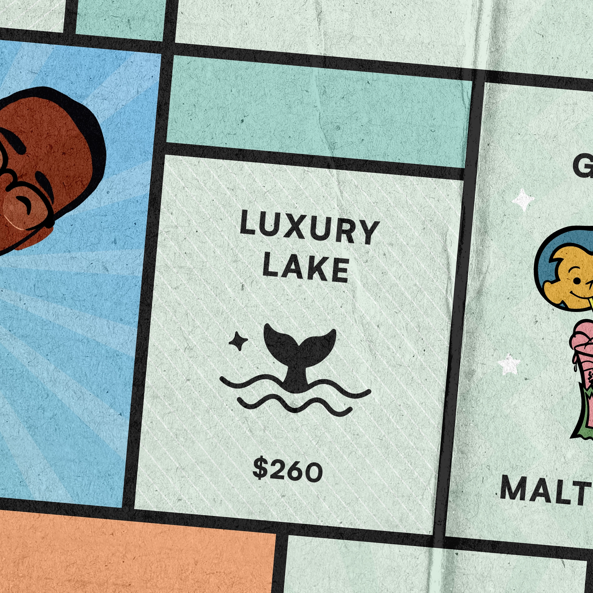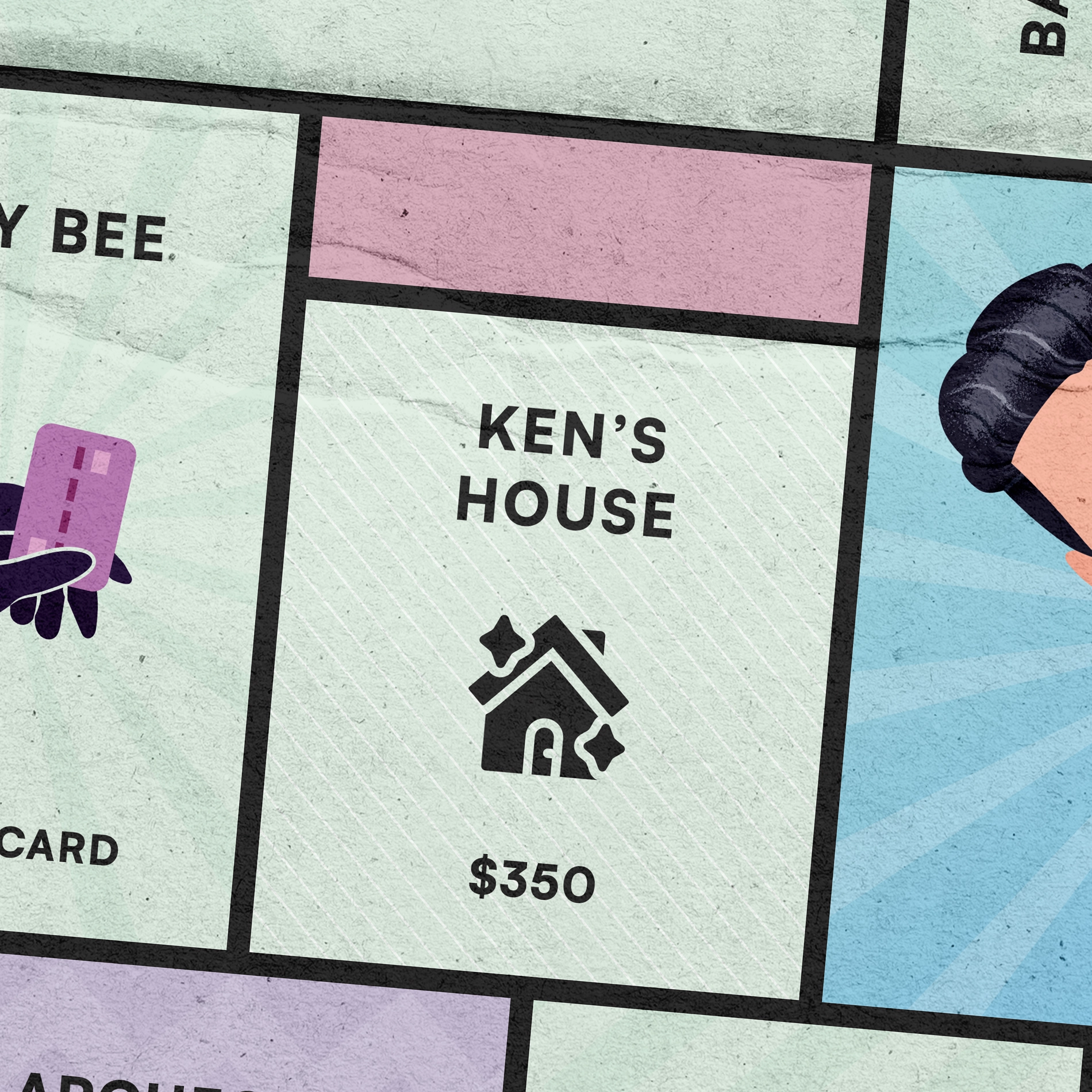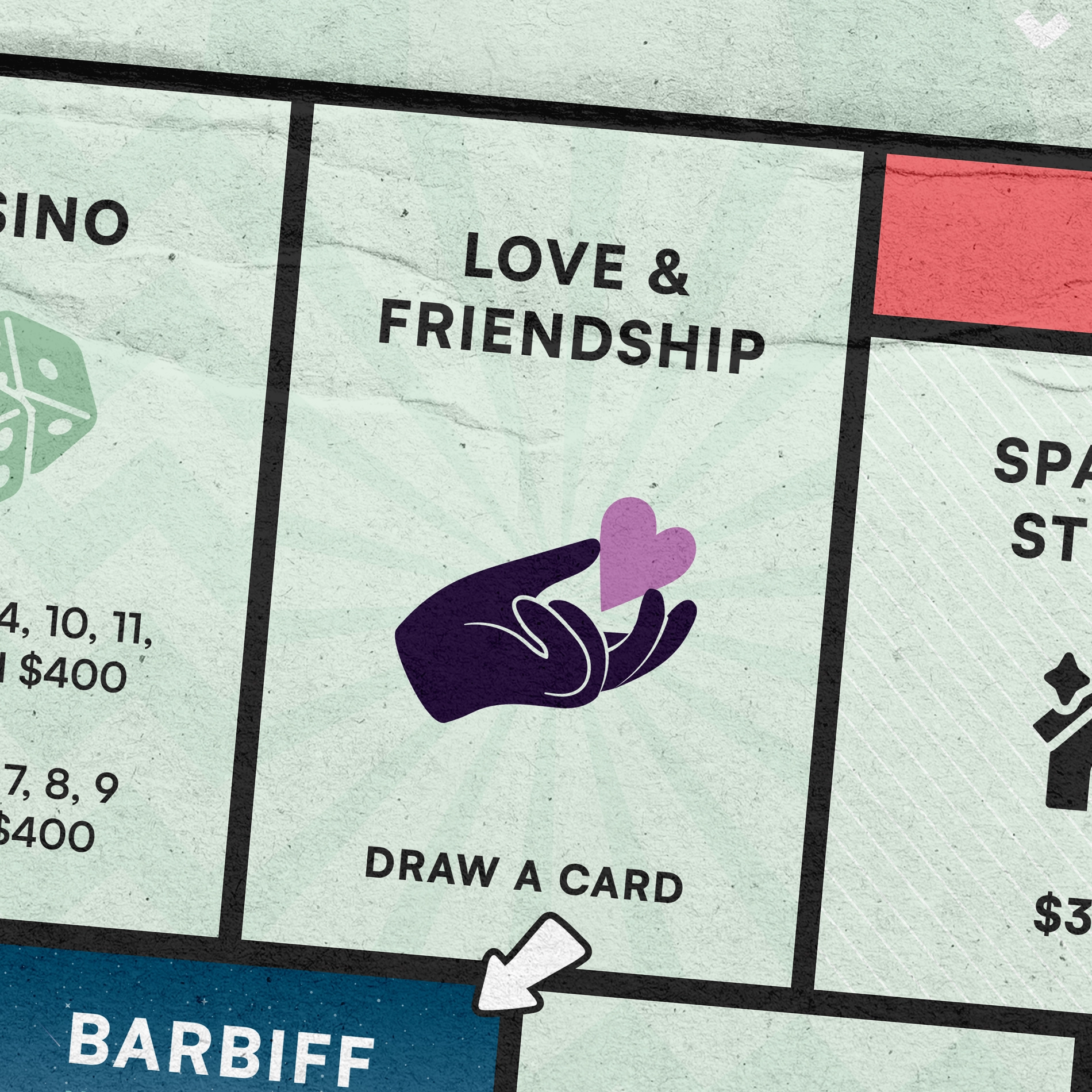 Les cases Propriété peuvent être achetées avec de l'argent. Pour acheter une carte Propriété, le joueur doit posséder une des 4 cartes Petit-Ami disponibles.